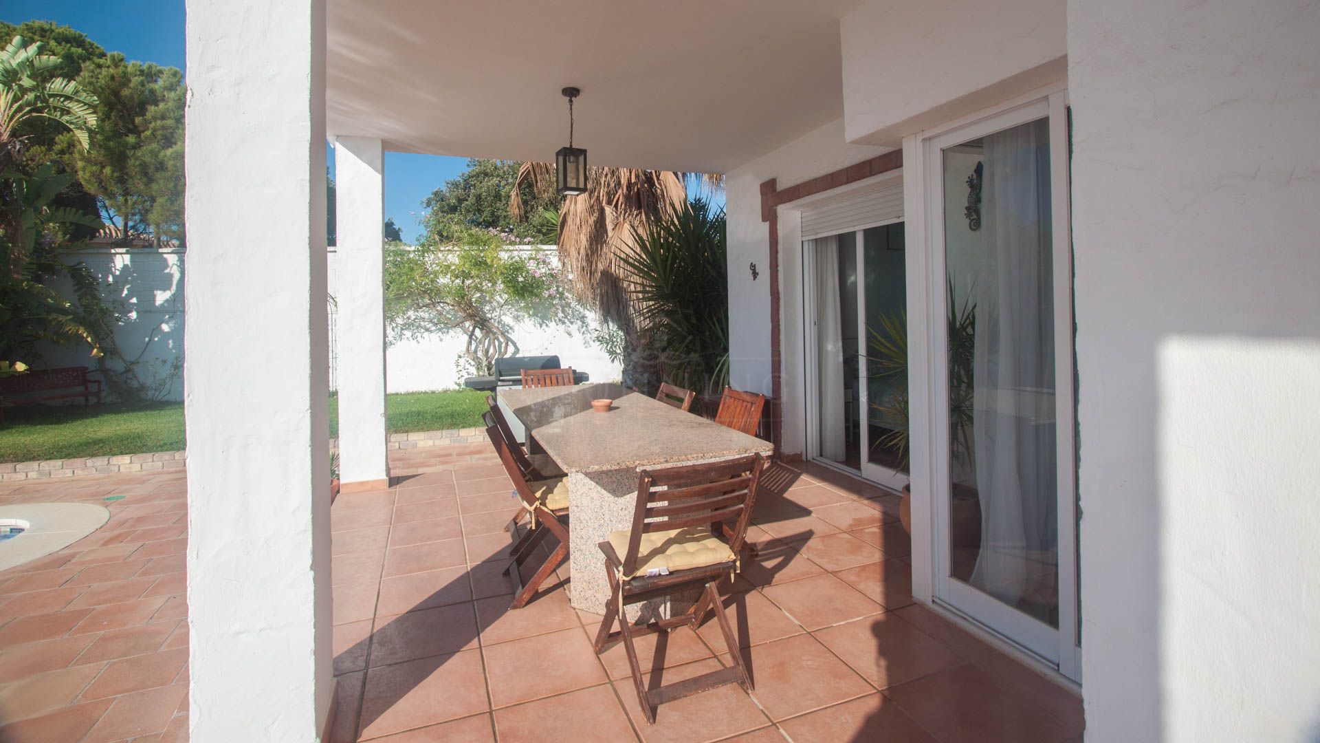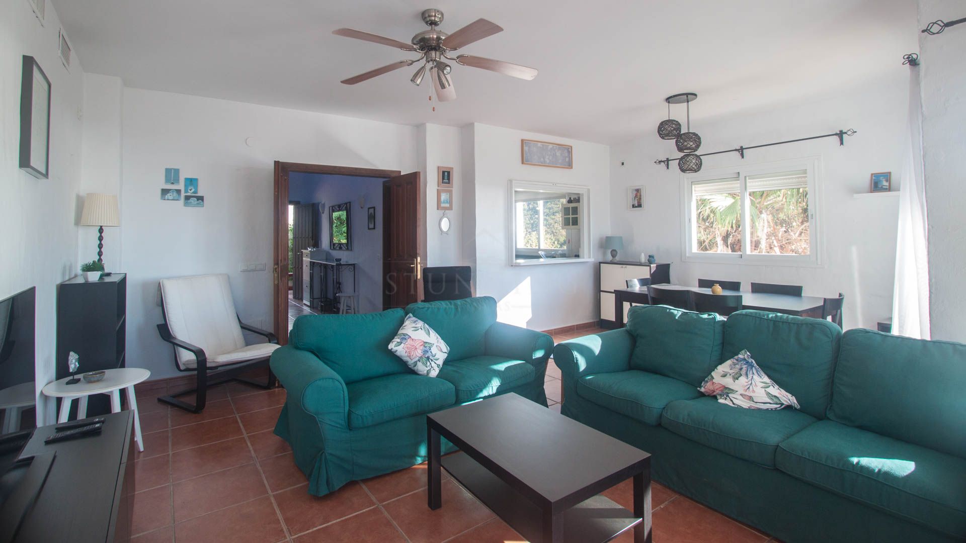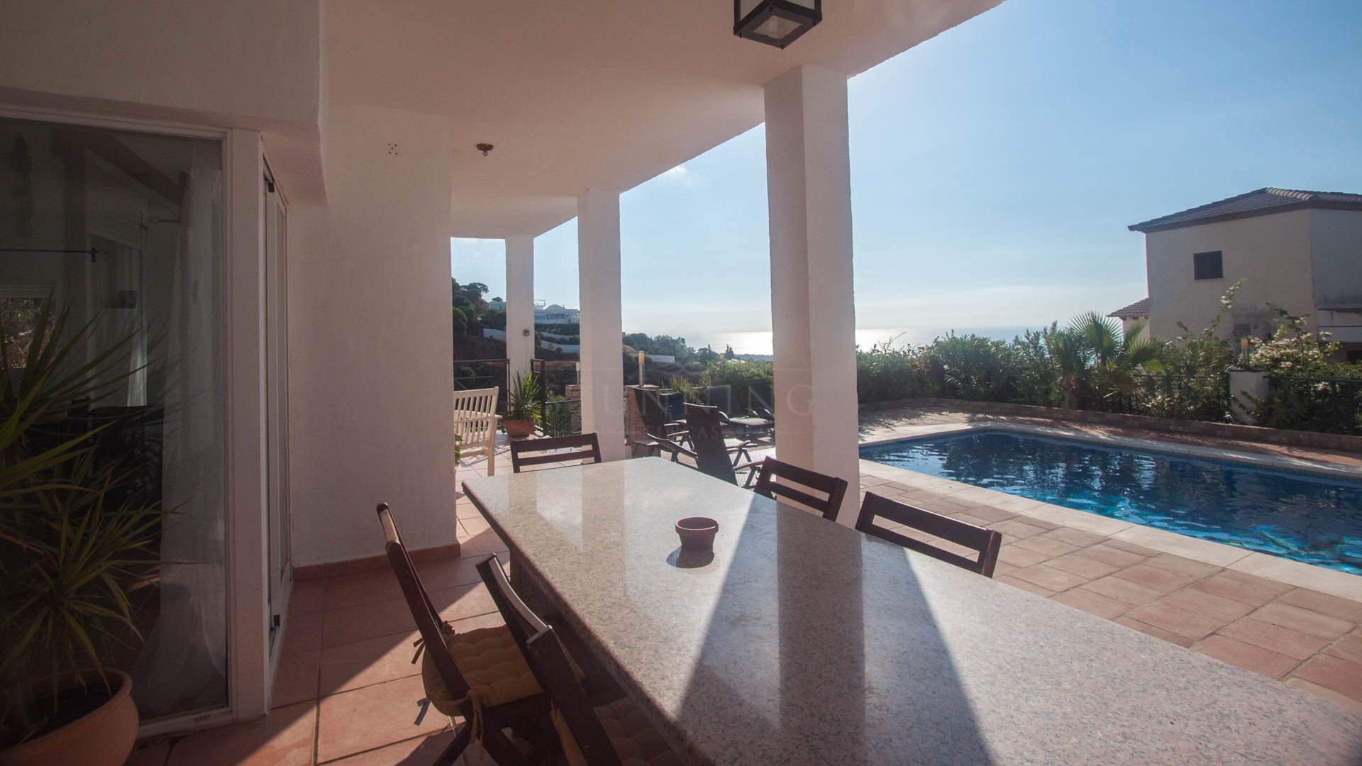 • Bright and spacious living room with fireplace, large windows, and sliding glass doors that open onto a covered porch with direct access to the pool and gardens – ideal for enjoying the sea views all year round.