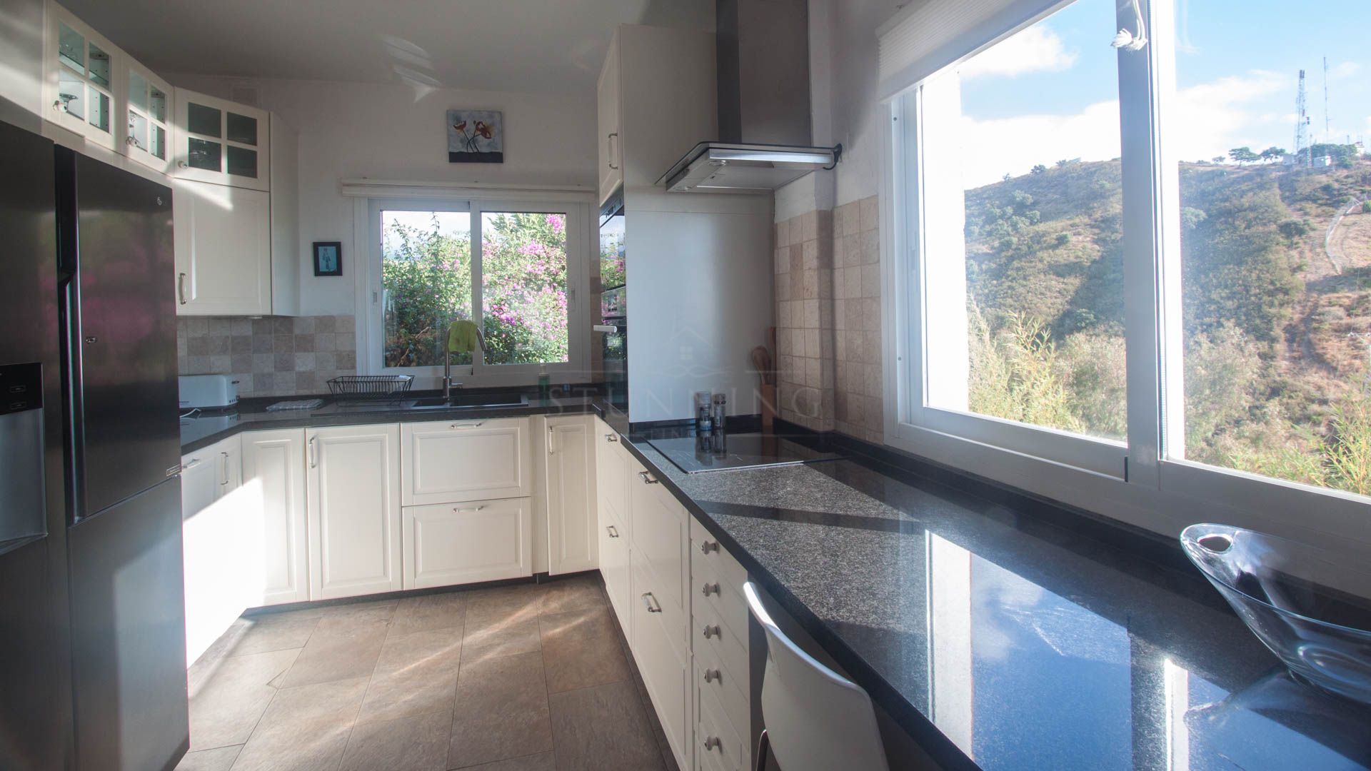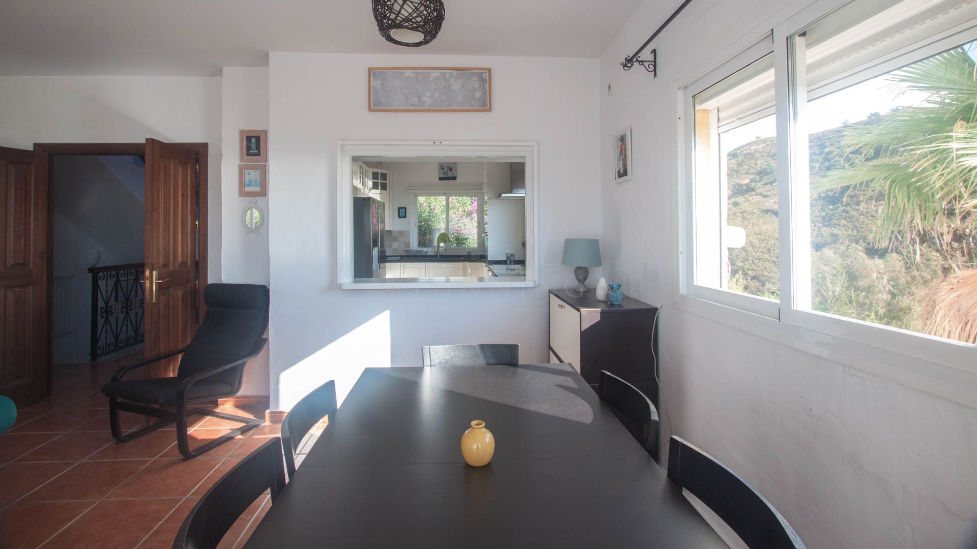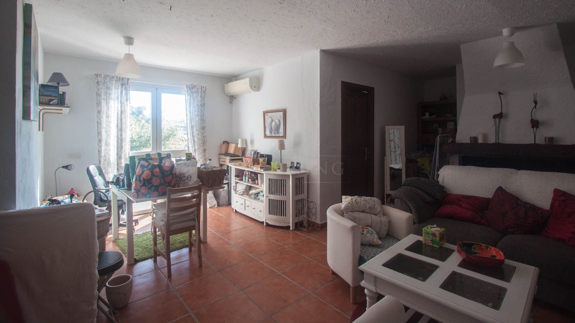 • Bright and spacious living room with fireplace, large windows, and sliding glass doors that open onto a covered porch with direct access to the pool and gardens – ideal for enjoying the sea views all year round.