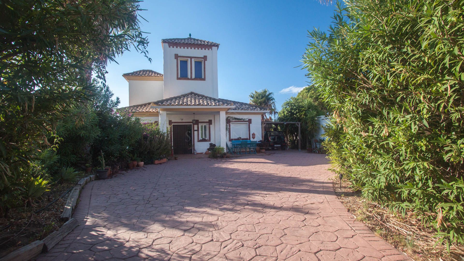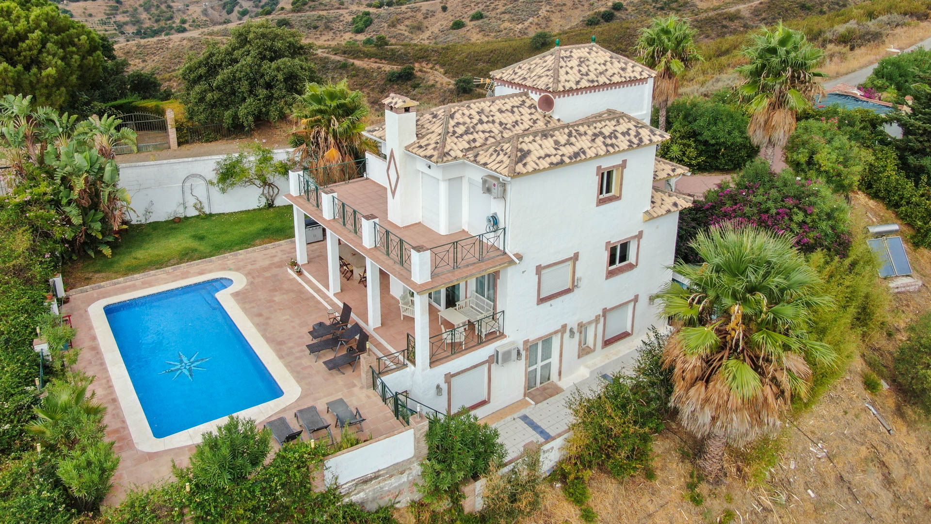 This Andalusian-style villa, featuring rustic touches and elegant architectural design, is built across three levels, with access through an electric gate that opens onto a spacious parking area.